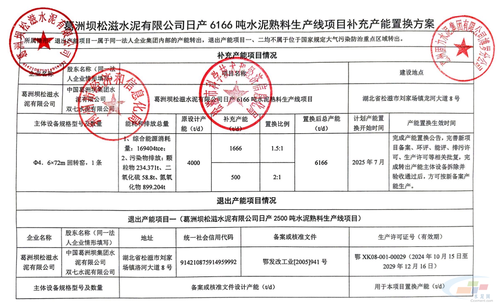 其中,1666t/d产能来自葛洲坝松滋公司2500t/d生产线,置换比例1.5:1;500t/d产能来自惠州固力水泥集团有限公司博罗分公司2500t/d生产线中的1000t/d,置换比例2:1。